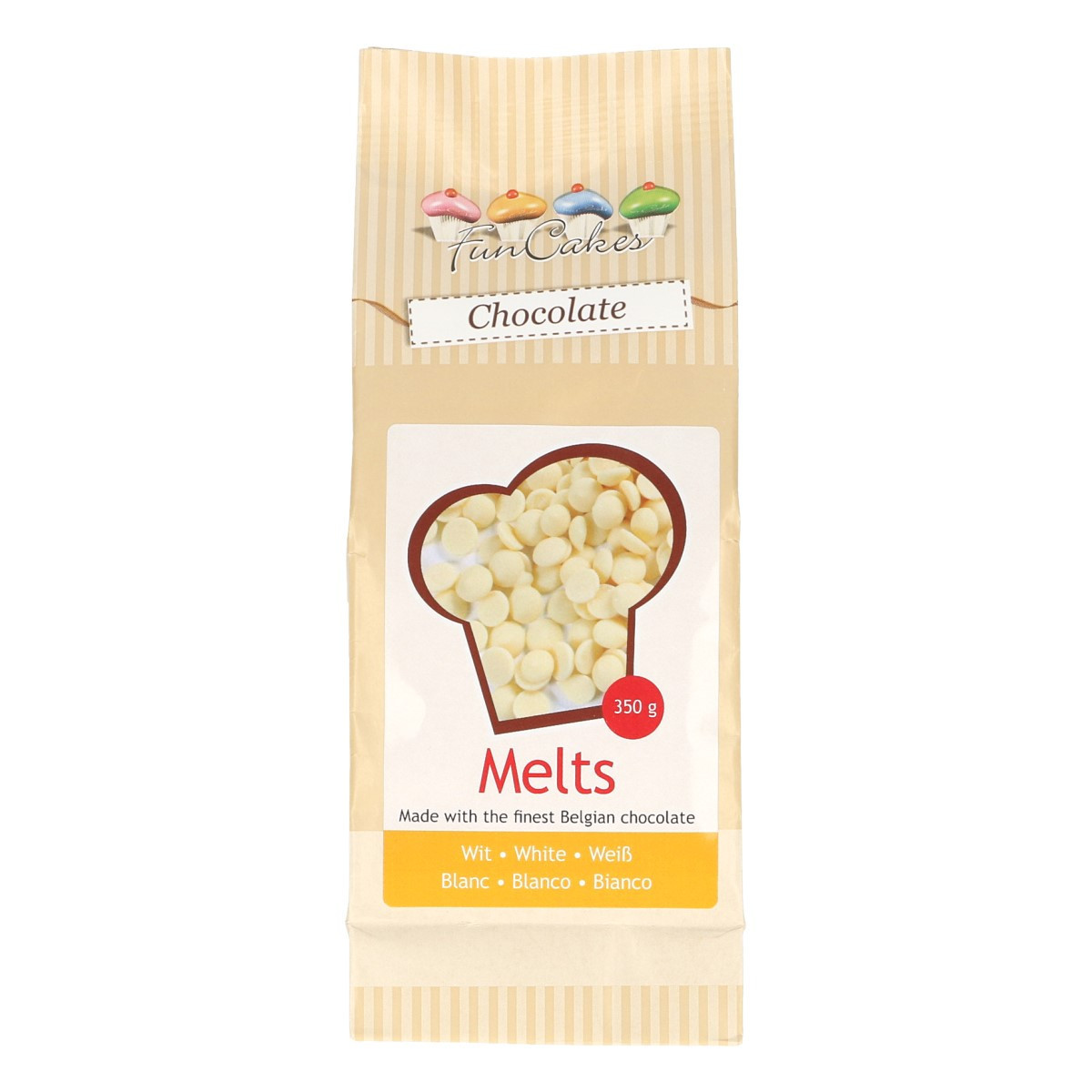 Os Choco Melts de chocolate branco da FunCakes têm um fantástico sabor. Poderá preencher os seus moldes e criar diferentes figuras ou desenhos, cobrir bolachas, biscoitos e decorar qualquer bolo.