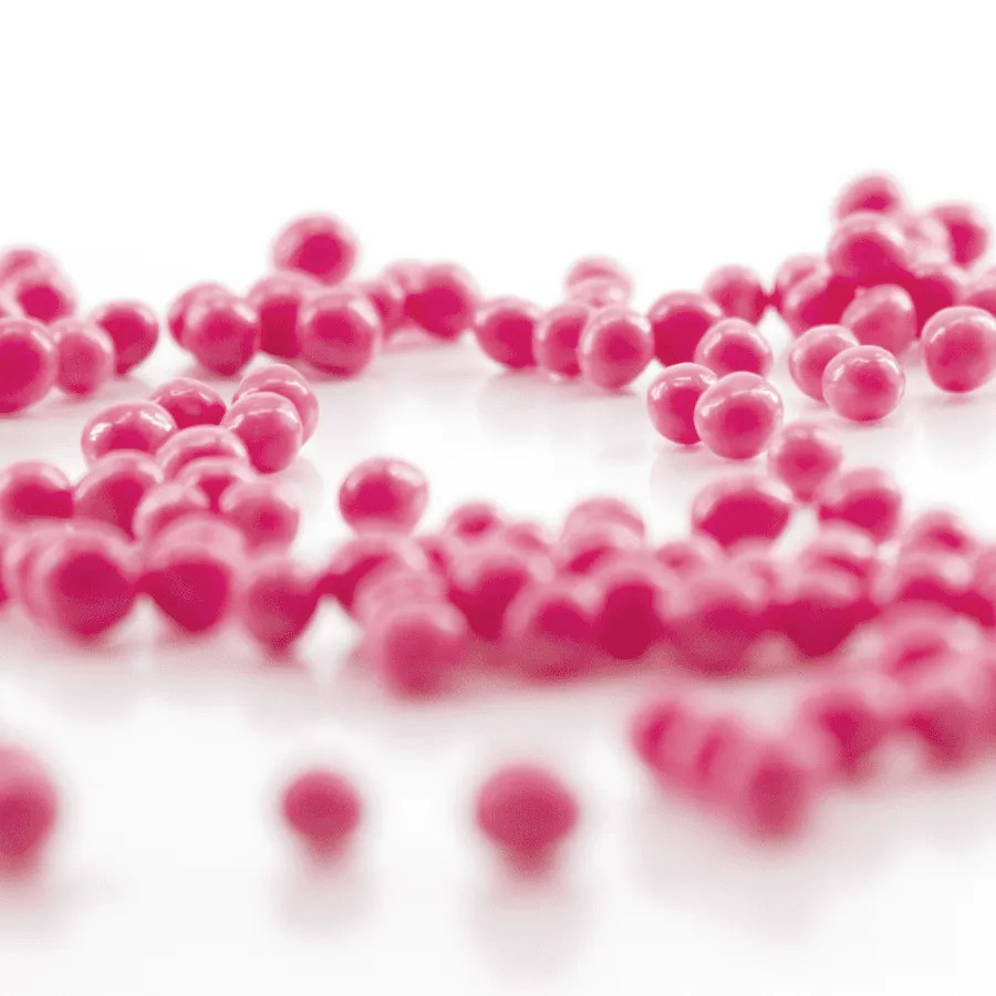 Bolas crocantes de cor rosa, de arroz e cereais, cobertos com chocolate, com sabor a morango.