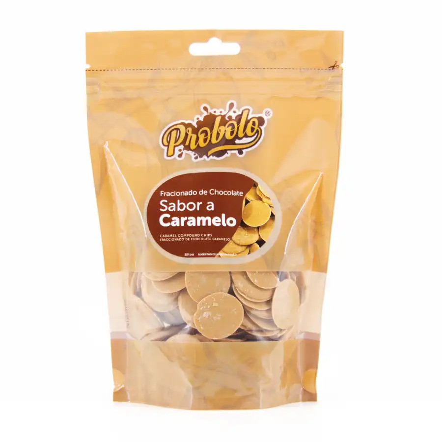 Fracionado de chocolate em pastilha, de ótimo sabor a caramelo