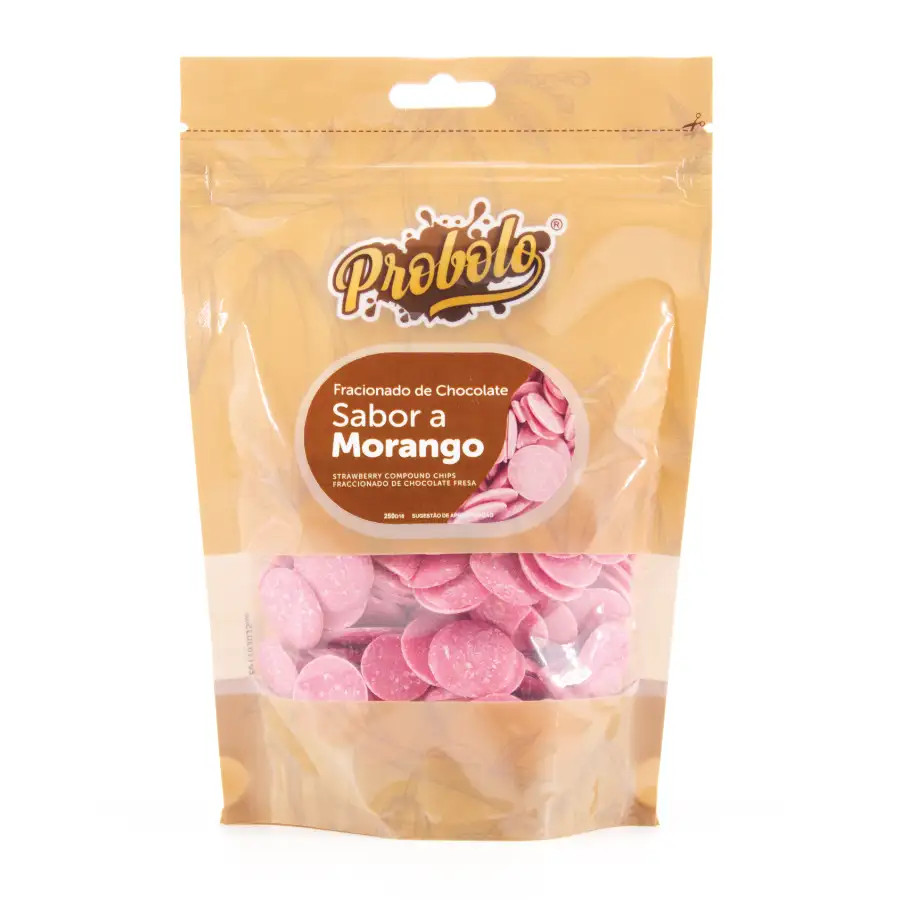 Fracionado de chocolate em pastilha, de cor rosa, de ótimo sabor a morango.