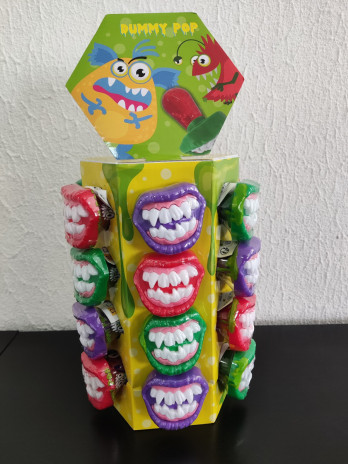 Um chupa chupa com formato de chucha, com dentadura medonha, terrorífica para brindar os mais pequenos no halloween. Sabor a morango.Disponíveis em cores sortidas.