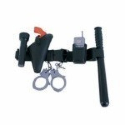 o cinto tem o coldre, a pistola, algemas e respectivas chaves, cassetete, walkie talkie e lanterna (tem mesmo luz, leva pilha)