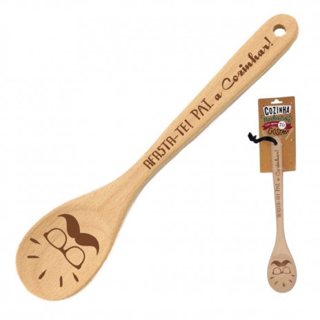 Para oferecer no dia do pai, uma colher de pau, com a inscrição "Afasta-te! Pai a cozinhar!".