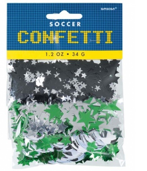 Pacote de confetis contendo 3 desenhos diferentes, incluindo estrelas grandes médias e pequenas nos tons de preto, verde e prata
