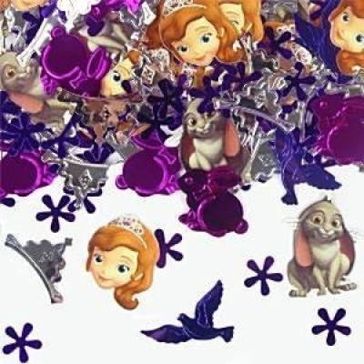 Confettis metalizados em tons roxo, prateado, rosa e azul. Com formas de pombas, coelhos, flores, e as personagens Sofia e o seu amigo Clover.