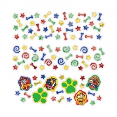 Confetis metalizados em cores sortidas. Com formas de ossos, estrelas, remoinhos, e as personagens da serie Paw Patrol.