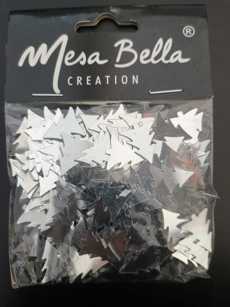 Embalagem de confettis de árvores de natal em prateado brilhante. Ideal para decorar a sua mesa de natal.