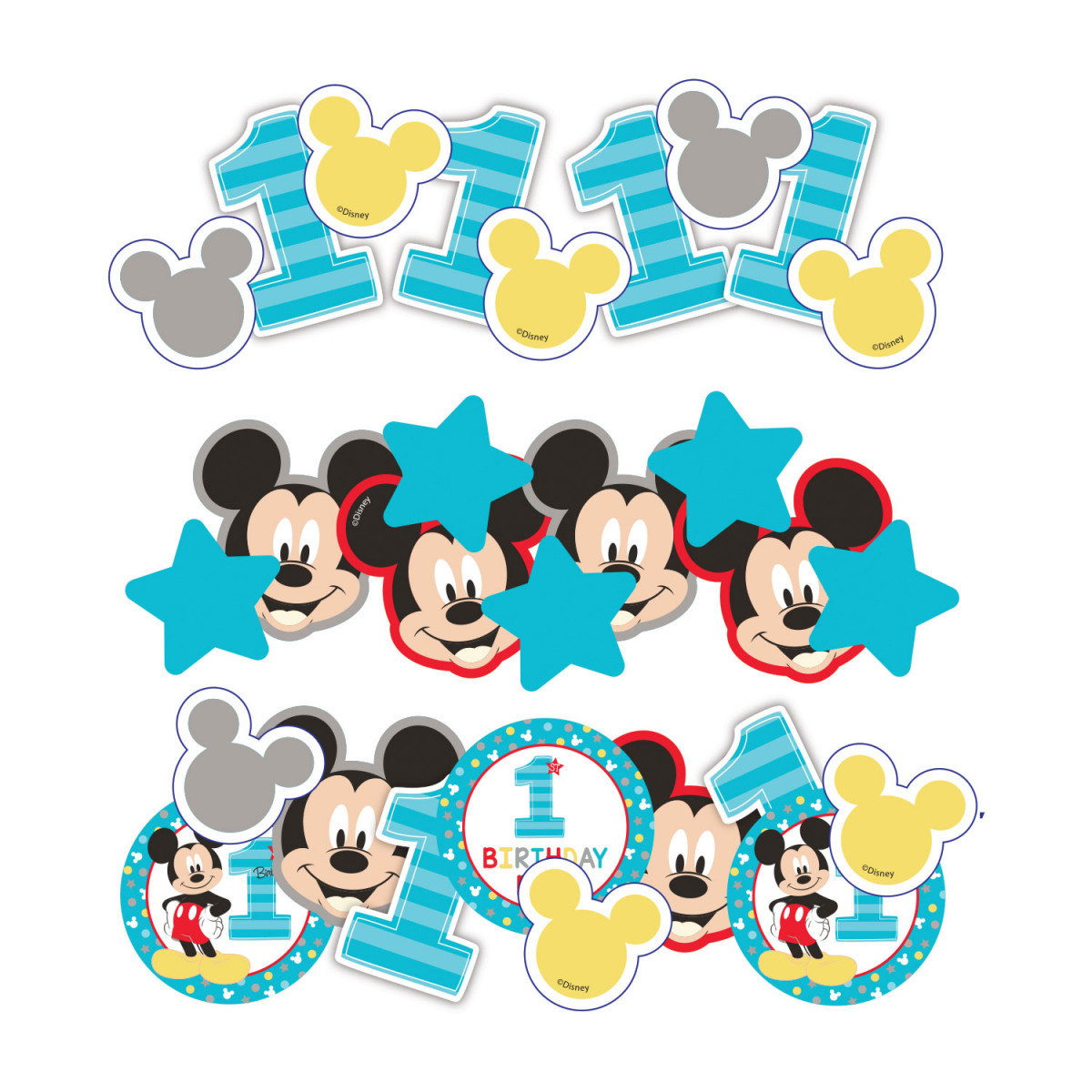 Conjunto de 3 packs de confettis sortidos do Mickey Mouse para decoração da primeira festa de aniversário em mesas ou outros.