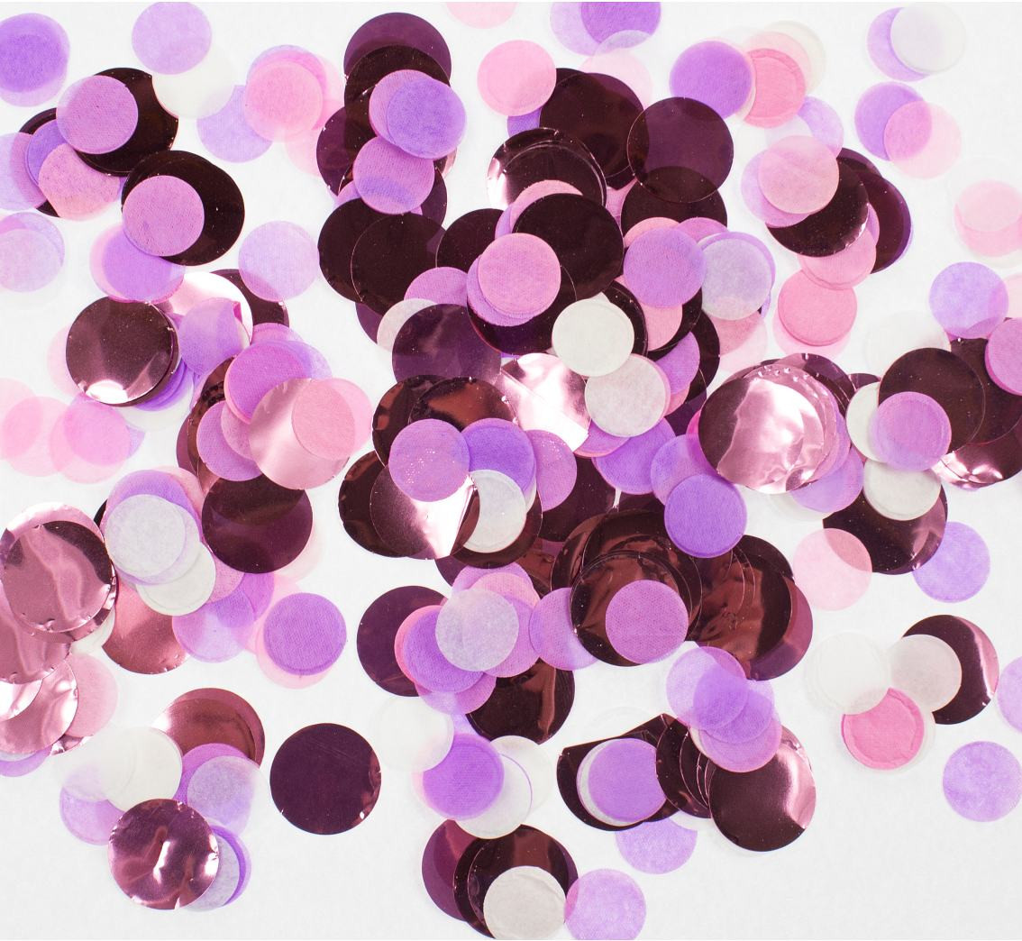 Embalagem de confettis redondos em tons de rosa, branco e prateado com cerca de 20g. Há confettis em papel simples e metalizados.