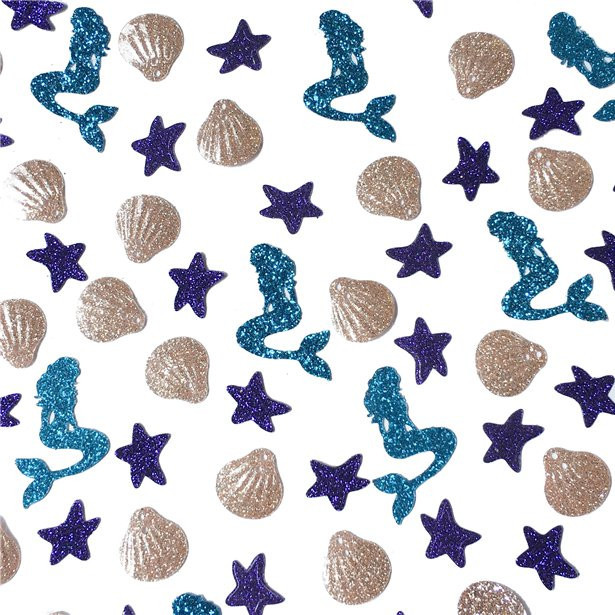 Embalagem de confettis com glitter em forma de sereias, estrelas e conchas do mar. Ideal para as festas de sereia.