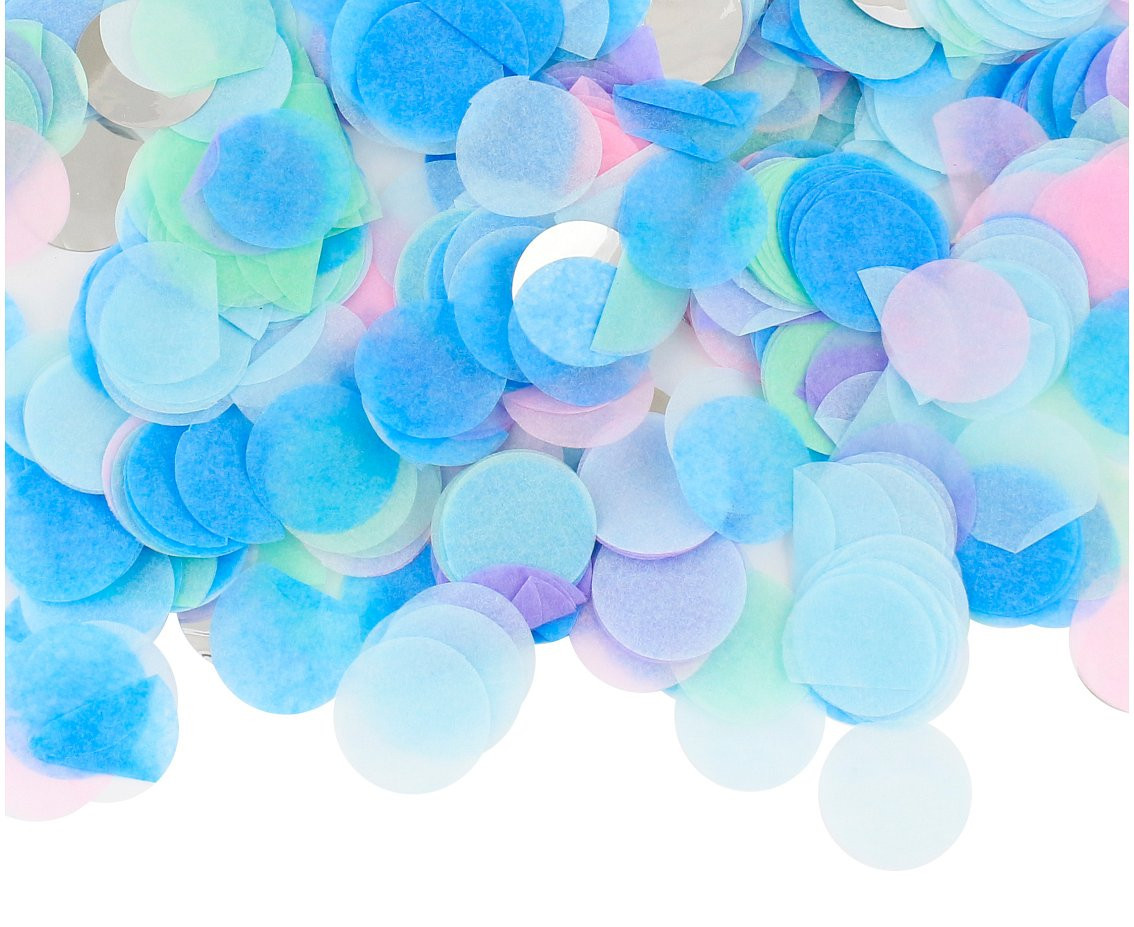 Embalagem de confettis em tons pastel, em papel e em foil em círculos com cerca de 2.5cm.
