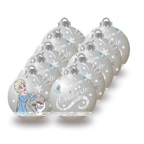 Pack de 10 bolas de natal em prateado para decoração de árvore de natal com cerca de 6cm de diâmetro, da Frozen da Disney.