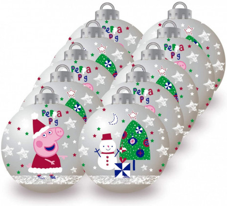 Pack de 10 bolas de natal em prateado para decoração de árvore de natal com cerca de 6cm de diâmetro, da Porquinha Peppa.