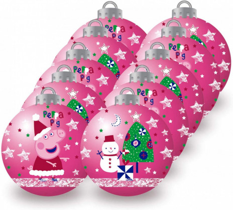 Pack de 10 bolas de natal em rosa para decoração de árvore de natal com cerca de 6cm de diâmetro, da Porquinha Peppa.