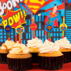Pack 10 velas do Super Man da DC Comics com cerca de 10cm com as personagens para decoração do bolo de aniversário.