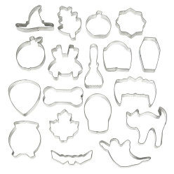 Contém as seguintes formas: chapéu de bruxa, osso, fantasma, teia de aranha, maçã, aranha, caveira, caldeirão, dentes de vampiro, caixão, lápide, vassoura, folha de carvalho, gato, abóbora, morcego, grão de milho, folha de bordo.