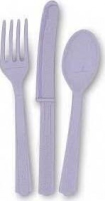 Conjunto de talheres, 6 colheres, 6 facas e 6 garfos em plástico para festas em tom de lavanda.