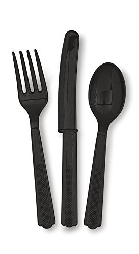 Conjunto de talheres plásticos na cor preta constituido por 6 colheres, 6 facas e 6 garfos, ideais para temas em tons negros como o Halloween.