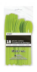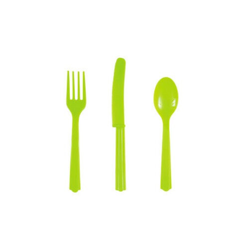 Embalagem com 18 talheres em verde neon. Seis facas, seis garfos e seis colheres para usar em qualquer festa. É lavável e reutilizável.