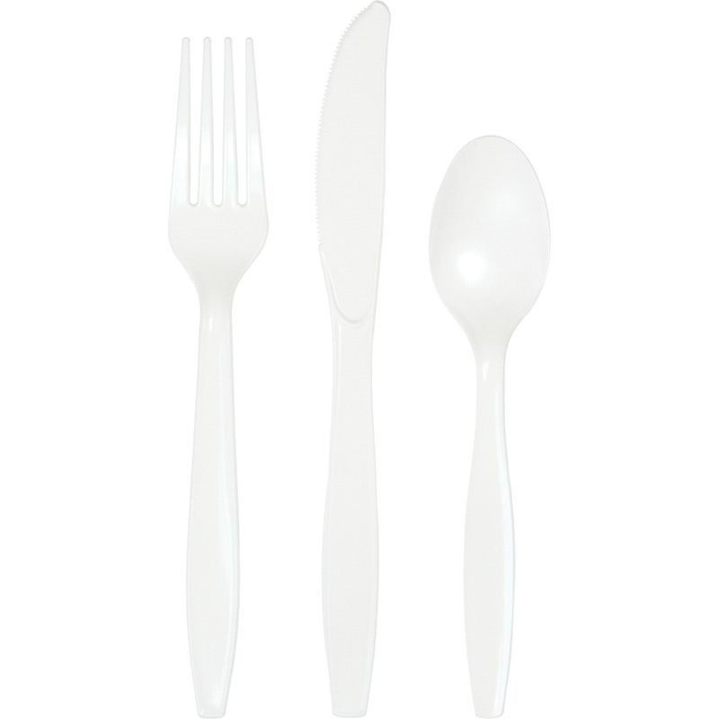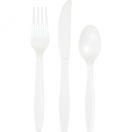 Embalagem com 24 talheres em branco. 8 facas, 8 garfos e 8 colheres para usar em qualquer festa. É lavável e reutilizável.