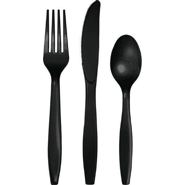 Embalagem com 24 talheres em preto. 8 facas, 8 garfos e 8 colheres para usar em qualquer festa. É lavável e reutilizável.