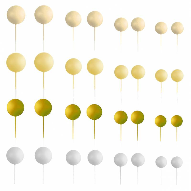 Conjunto de 32 peças de esferas de espuma para decorar os seus bolos e eventos. São feitas de espuma e arame. Os tamanhos destas esferas são: -8 novelos de 2 cm (2 amarelos, 2 beges, 2 brancos e 2 dourados). -8 bolas de 2,5 cm. (2 amarelas, 2 beges, 2 brancas e 2 douradas). -8 novelos de 3 cm. (2 amarelos, 2 beges, 2 brancos e 2 dourados). -8 bolas de 4 cm. (2 amarelas, 2 beges, 2 brancas e 2 douradas). Esta decoração é fácil de montar e pode ser perfurada diretamente nas suas criações.