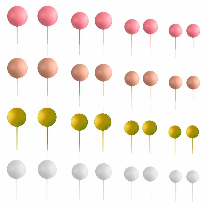 Conjunto de 32 peças de esferas de espuma para decorar os seus bolos e eventos. São feitas de espuma e arame. Os tamanhos destas esferas são: -8 bolas de 2 cm (2 cor-de-rosa, 2 ouro rosa, 2 brancas e 2 douradas). -8 bolas de 2,5 cm. (2 cor-de-rosa, 2 ouro rosa, 2 brancas e 2 douradas). -8 bolas de 3 cm (2 cor-de-rosa, 2 cor-de-rosa dourado, 2 brancas e 2 douradas). -8 bolas de 4 cm. (2 cor-de-rosa, 2 ouro rosa, 2 brancas e 2 douradas). Esta decoração é fácil de montar e pode ser perfurada diretamente nas suas criações.