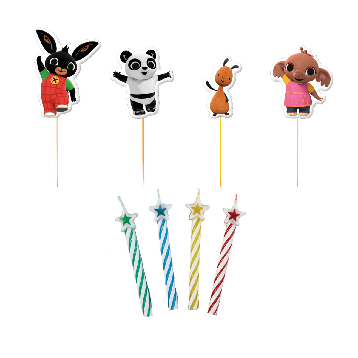 Para complementar a tua festa de aniversário, 4 velas e toppers para bolo do Bing.