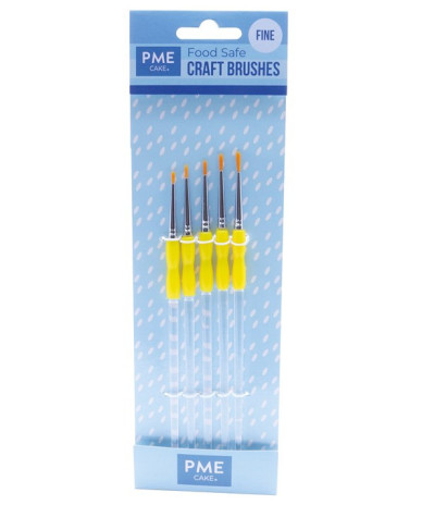 Conjunto de 5 pincéis de cerdas de tamanhos diferentes. Ideal para pintar, polvilhar e adicionar detalhes finos a todos os tipos de criações. A parte plástica lisa e transparente do cabo também pode ser usada como um pequeno rolo para enrolar pequenos e delicados pedaços de pasta de açúcar.