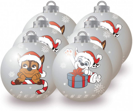 Pack de 6 bolas de natal em prateado para decoração de árvore de natal com cerca de 8cm de diâmetro, da Paw Patrol.