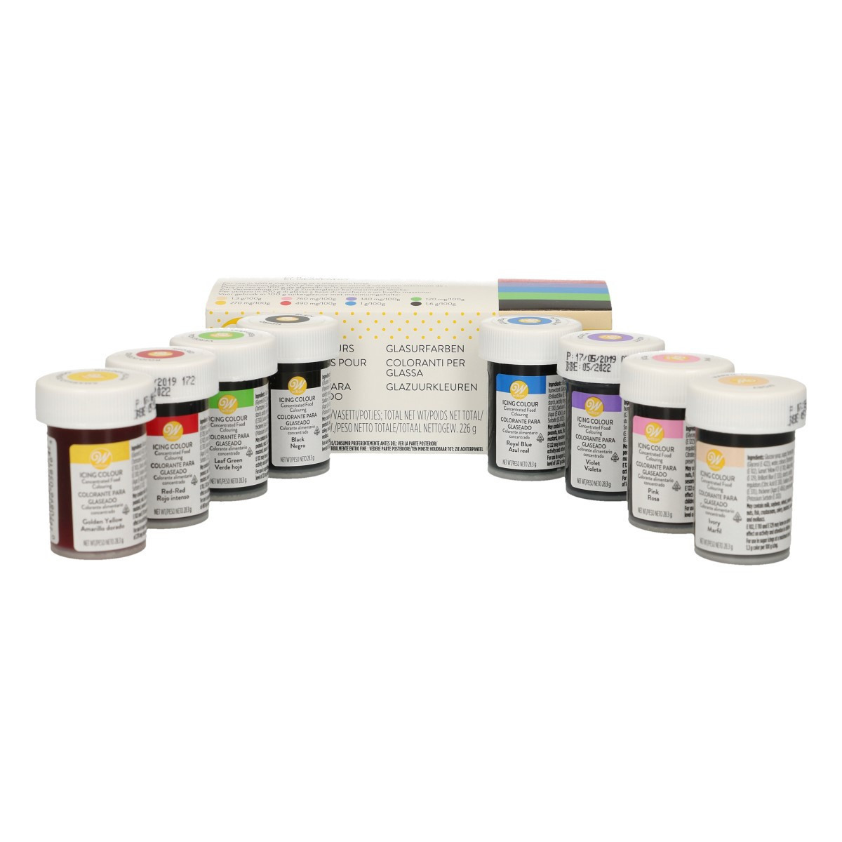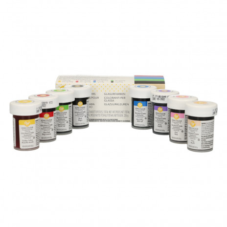 Pack de oito corantes alimentares em gel de cor marfim, amarelo dourado, rosa, vermelho intenso, violeta, azul royal, verde folha e preto da marca Wilton. São corantes concentrados para alimentos. É perfeito para colorir buttercream, maçapão, glacé e muitos outros preparados.