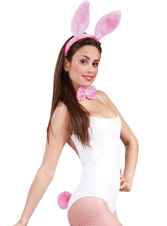 Kit com acessórios de coelho para complementar disfarce de carnaval. Com pormenores em cor de rosa.