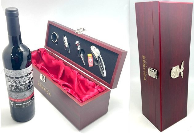 Elegante caixa de madeira do Sport Lisboa e Benfica, onde inclui uma garrafa de vinho assim como os acessórios para abertura do mesmo.