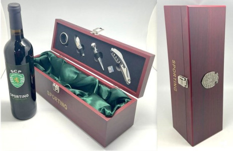 Elegante caixa de madeira do Sporting, onde inclui uma garrafa de vinho do assim como os acessórios para abertura do mesmo.