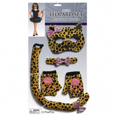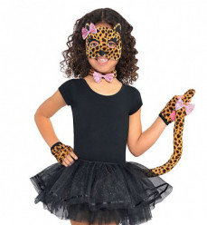 Kit com acessórios de leopardo para complementar disfarce de carnaval. Com pormenores em cor de rosa.