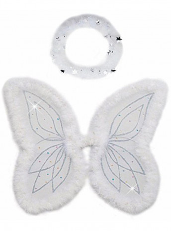 Conjunto de asas e respetivos elásticos, com penas brancas e auréola para disfarce de anjo. Contém pequenos detalhes brilhantes.