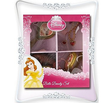 Conjunto de beleza Disney Bela composto por 7 peças que inclui peruca, espelho, pente, escova, brilho para lábios, colar e anel.