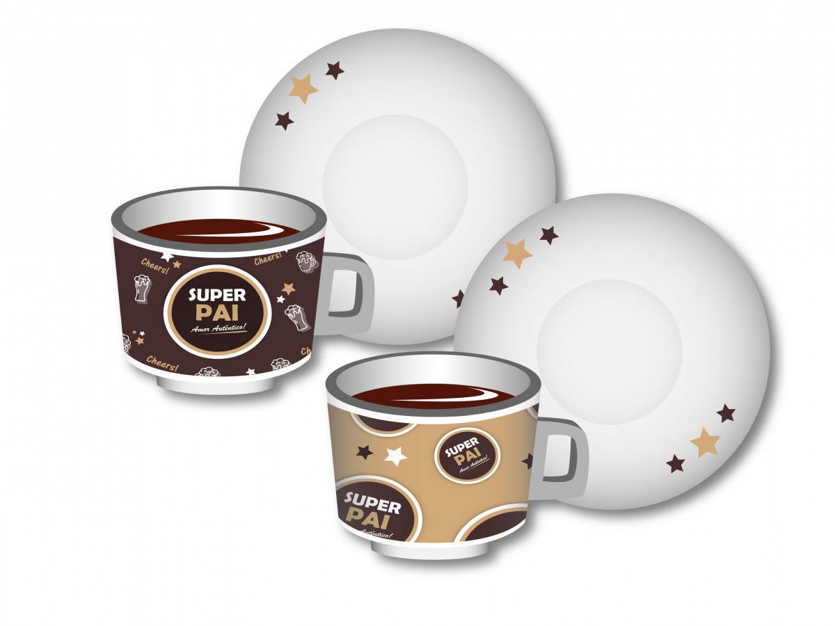 Set de pires e chávena para tomar café com a inscrição "Super Pai" em tons de castanho e branco. Ideal para oferta para o dia do Pai. Com caixa brinde.