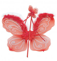 Kit de 3 peças para te mascarares de borboleta. Inclui asas, bandolete e varinha em tons de roxo.