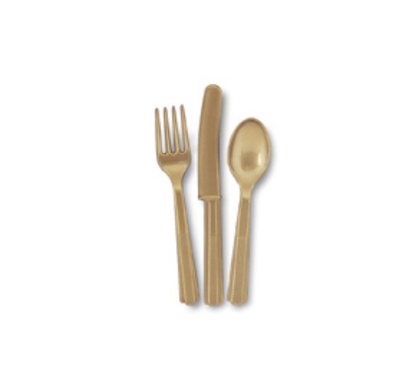 Conjunto de 18 talheres descartáveis em tom dourado metalizado.