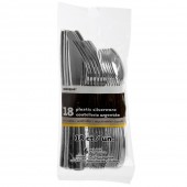 Conjunto de 18 talheres descartáveis em tom prateado.