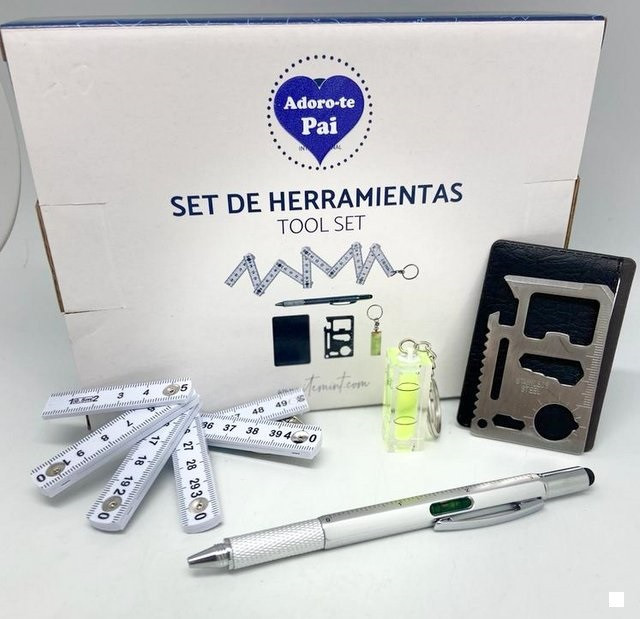 Para oferecer no dia do pai, um conjunto de ferramentas muito úteis. Inclui acessórios para a medição, marcação e para nivelar, etc.