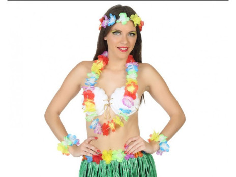 Para disfarces havaianos, estes lindo conjunto havaiano, composto por bandolete, colar e pulseiras.
