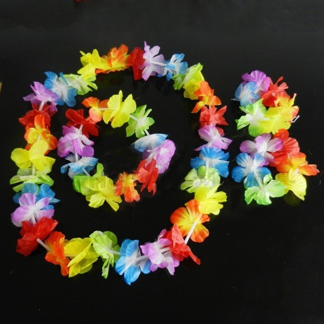 Conjunto de 1 colar, 2 pulseiras e 1 fita para a cabeça Havaiano de várias cores.