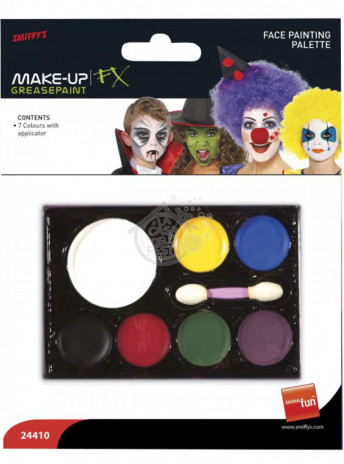 Este conjunto inclui 7 cores de pintura facial, branco, amarelo, azul, preto, vermelho, verde e roxo e um aplicador.