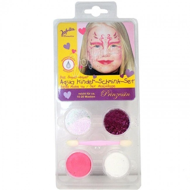 Contém: 4 caixas de 6 gr cada, pincel e pequeno manual de instruções para poder fazer a sua própria maquilhagem ou pintura.