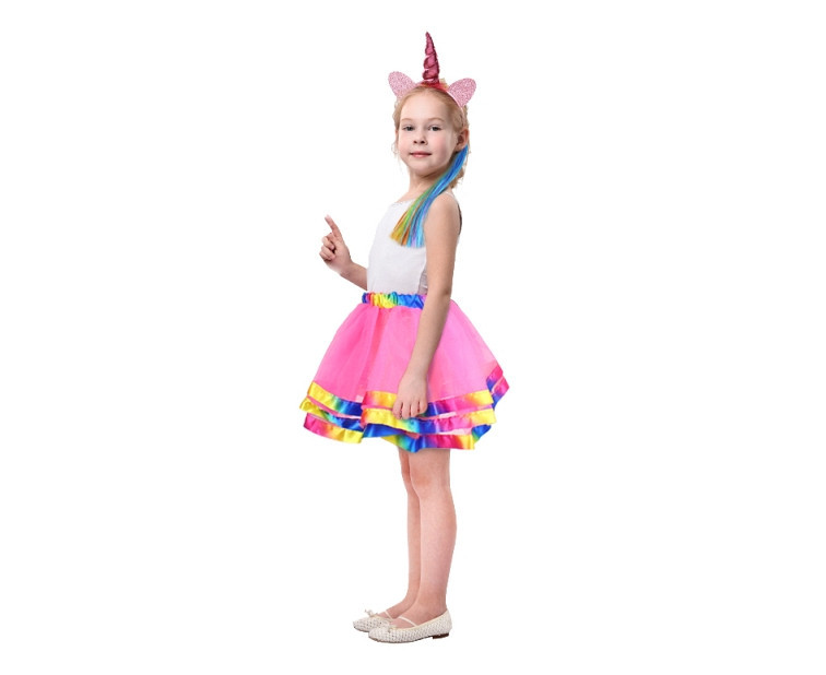 Kit de 3 peças de Unicórnio composto por saia colorida, bandolete com corninho e orelhas com glitter e madeixa com várias cores.