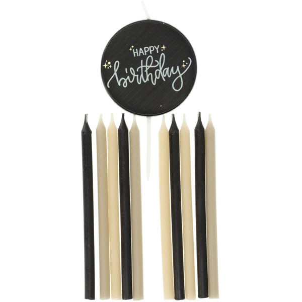 Pack de 11 velas com 9,5cm para decoração de bolo de aniversário. Contém 10 velas com suporte nas cores preta, creme, bege e 1 vela redonda com a incrição "Happy Birthday".