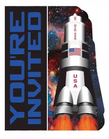 Pack de 8 convites de formato retangular com envelope para as festas de aniversário alusivo ao tema Espaço.