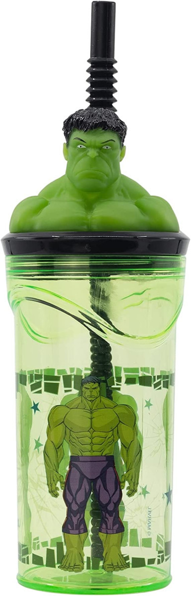 Copo com a cabeça do Hulk dos Vingadores da Marvel em 3D. Tem palhinha extensível e capacidade para 360ml.